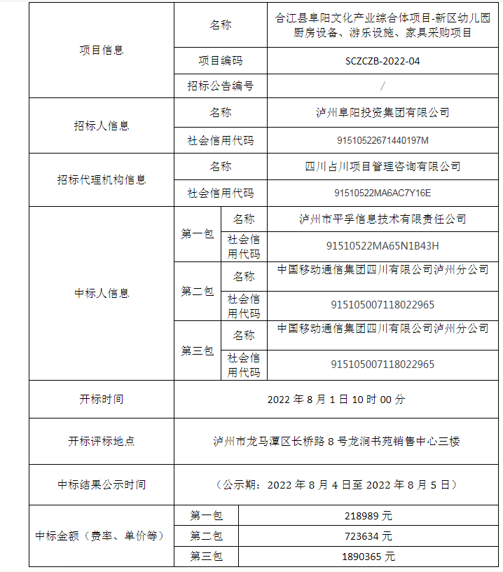 合江縣阜陽(yáng)文化產(chǎn)業(yè)綜合體項(xiàng)目-新區(qū)幼兒園廚房設(shè)備、游樂(lè)設(shè)施、家具采購(gòu)項(xiàng)目公開(kāi)招標(biāo)中標(biāo)結(jié)果公告