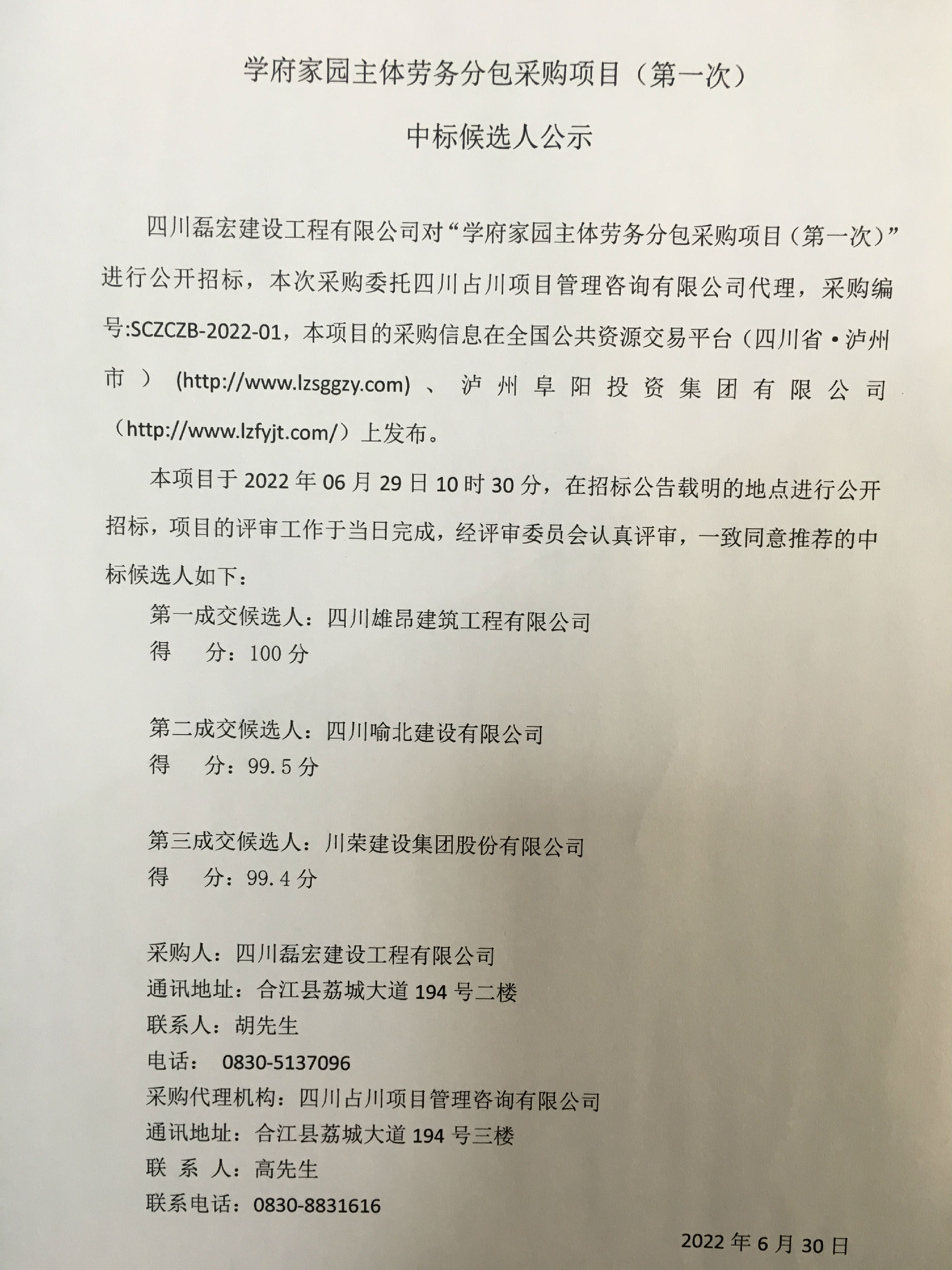 學(xué)府家園主體勞務(wù)分包采購項(xiàng)目(第一次)中標(biāo)候選人公示