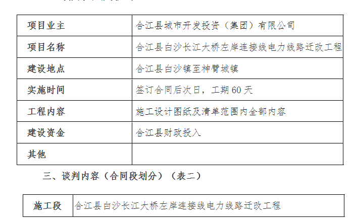 一、 本次談判項(xiàng)目為合江縣白沙長(zhǎng)江大橋左岸連接線電力線路遷改工 程, 現(xiàn)通過競(jìng)爭(zhēng)性談判方式選擇和確定承包人, 誠(chéng)邀符合資格條件的 潛在申請(qǐng)人參與本項(xiàng)目的競(jìng)爭(zhēng)性談判。