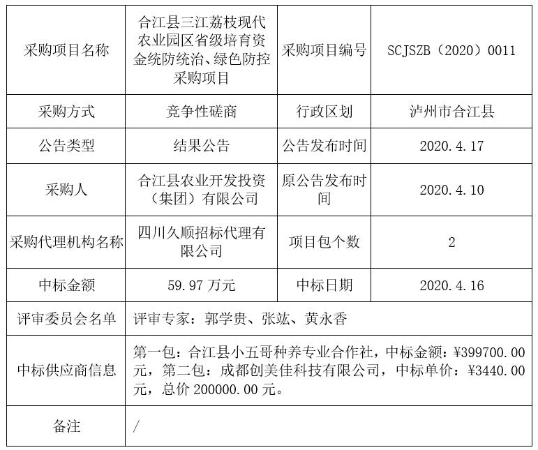 合江縣三江荔枝現(xiàn)代農(nóng)業(yè)園區(qū)省級培育資金統(tǒng)防統(tǒng)治、綠色防控采購項目競爭性磋商結(jié)果公告