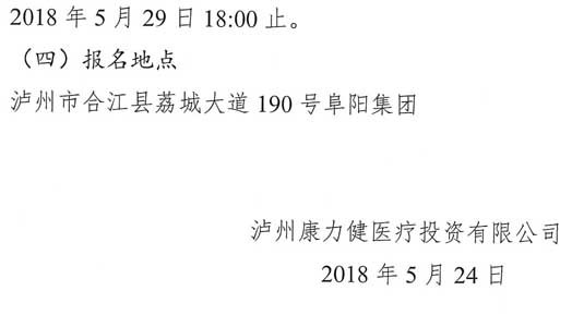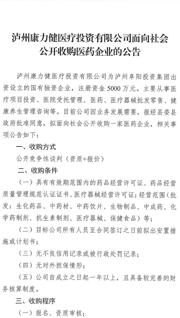瀘州康力健醫(yī)療投資有限公司面向社會公開收購醫(yī)藥企業(yè)的公告.doc